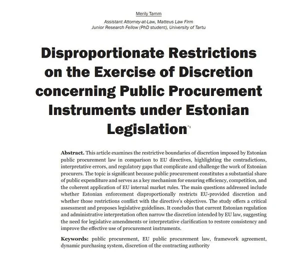 Merily Tamm kirjutas hiljuti ilmunud Juridica Internationali artiklis sellest, kuidas Eesti riigihangete seadus ja selle tõlgendamispraktika piiravad hankijate diskretsiooni rohkem, kui seda näevad ette ELi riigihangete direktiivid.